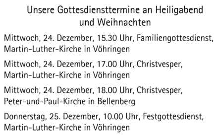 Mittwoch, 24. Dezember, 15.30 Uhr, Familiengottesdienst,Martin-Luther-Kirche in Vöhringen Mittwoch, 24. Dezember, 17.00 Uhr, Christvesper,Martin-Luther-Kirche in Vöhringen Mittwoch, 24. Dezember, 18.00 Uhr, Christvesper,Peter-und-Paul-Kirche in Bellenberg Donnerstag, 25. Dezember, 10.00 Uhr, Festgottesdienst,Martin-Luther-Kirche in Vöhringen